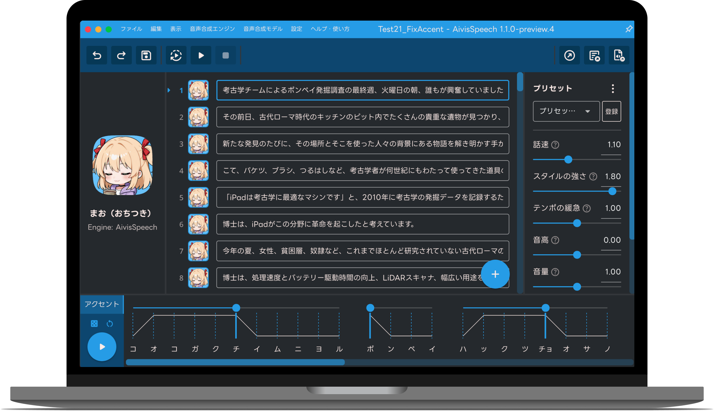 - 文ごとに話者スタイル・話速・テンポ・音量・前後無音・読み方・アクセント